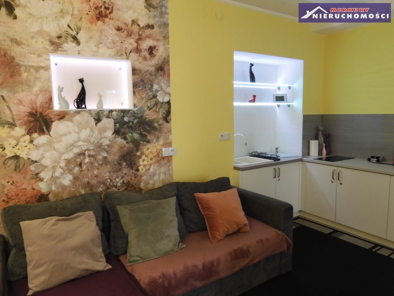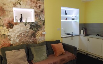2 - duży salon z aneksem kuchennym, pokój, łazienka; stylowy wystrój mieszkania.